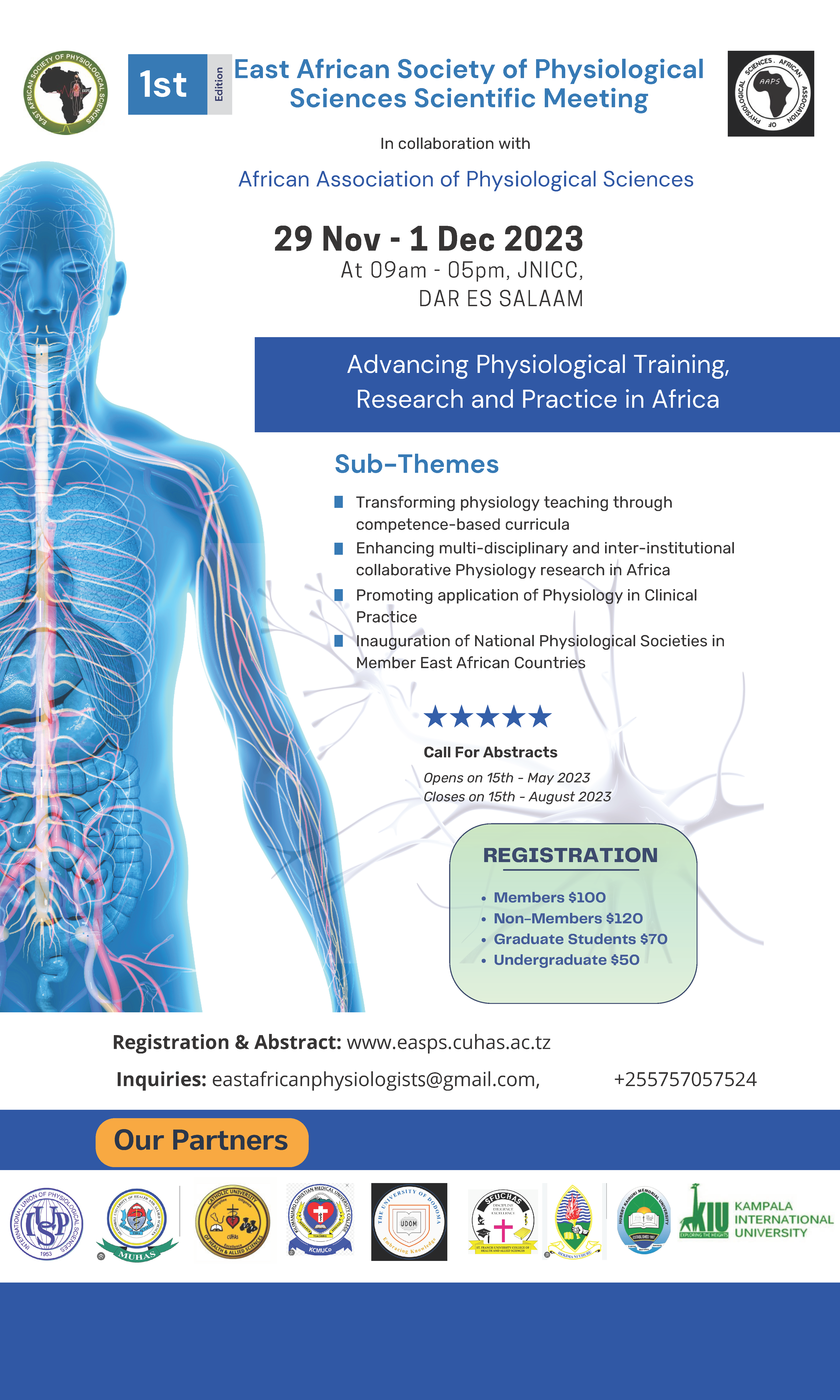 - Nov. 29-Dec.1 2023 1st East African Society of Physiologal Sciences scientific meeting, Dar Es Salaam, Tanzania